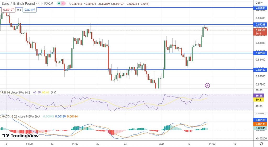 The Euro to Pound exchange rate has to rise above 0.8928, the high reached on February 17. If it does, it might potentially test the 0.9000 level after that before moving on to the yearly high at 0.8978.