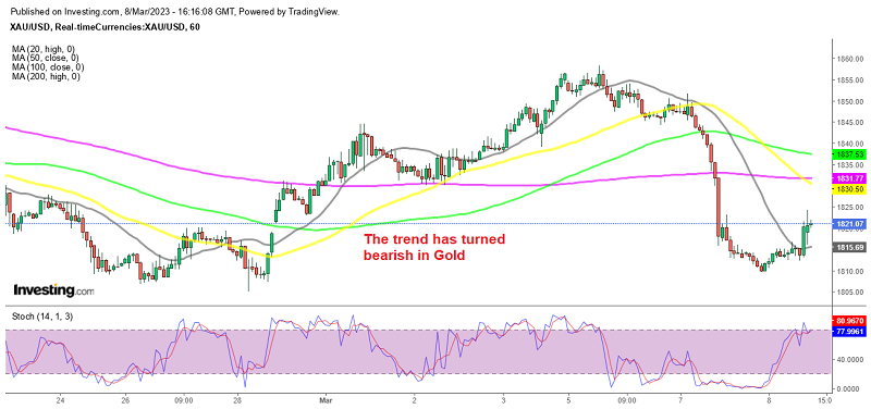 This sent the USD lower, but today’s economic data has been positive, which goes in favour of a stronger hike in March. Gold increased from below $1,810 earlier today, to $1,824 after Powell’s comments as the USD retreated lower. But, we decided to open a long term sell Gold signal, taking into account today’s data as well.