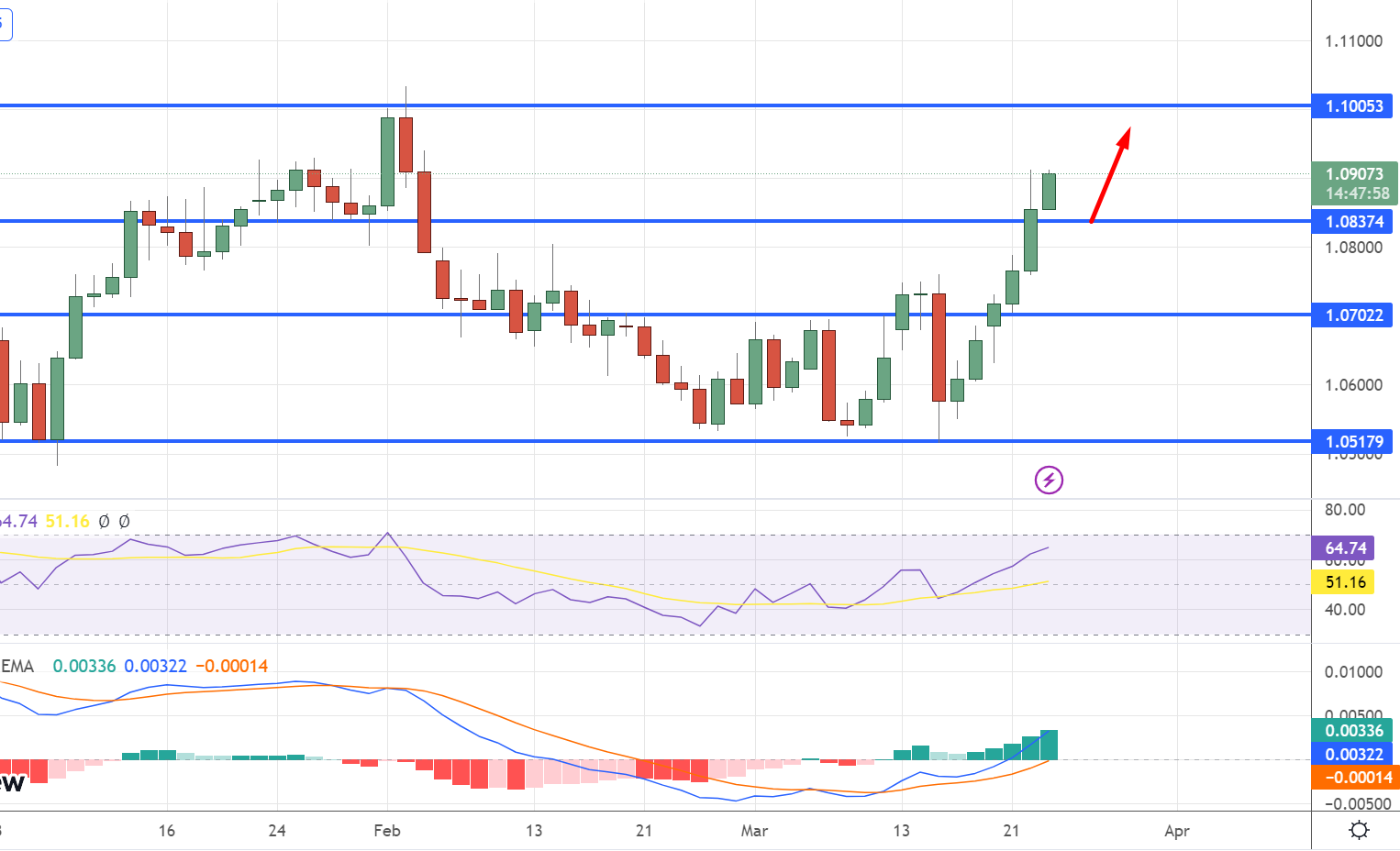 The EUR/USD pair is currently hovering close to the key resistance level of 1.0900 during the Asian trading session. This major currency pair is attempting to surpass this level, as the Federal Reserve (Fed) has hinted at a pause in its policy-tightening process. Fed Chair Jerome Powell’s statement that “some additional policy firming may be appropriate” has provided confidence to risk-associated currencies, implying that the Fed recognizes that the current monetary policy has progressed enough and will be restrictive enough to bring the United States Consumer Price Index (CPI) down to 2%. The US Dollar Index (DXY) has recently reached its lowest level in six weeks, at 102.61, as investors anticipate no further room for rate hikes from the Federal Reserve. The DXY is expected to continue its downward trajectory, as concerns over the US banking crisis persist.
