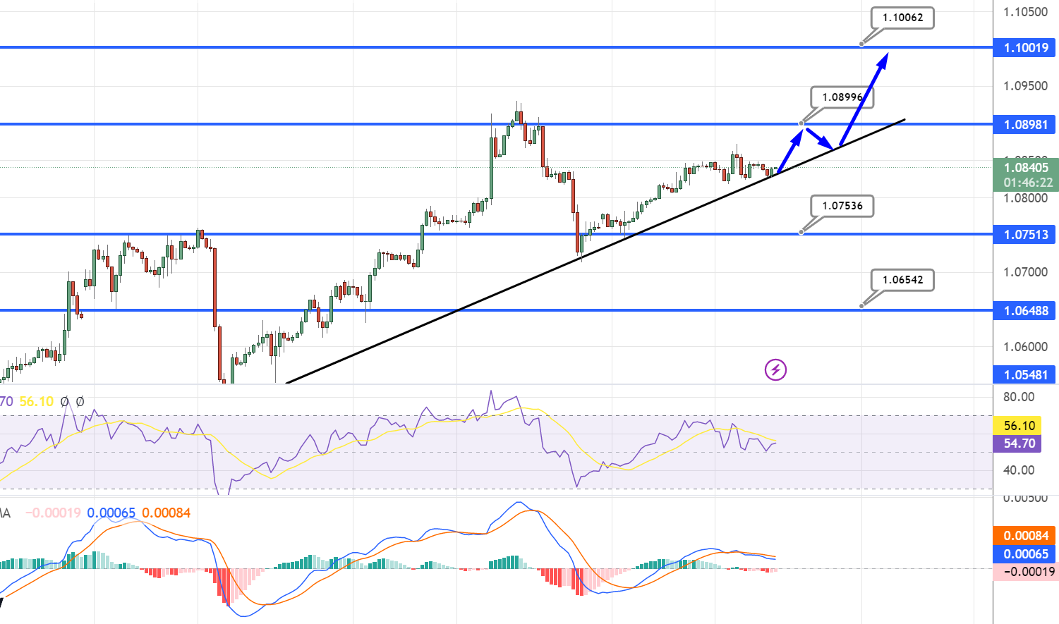 The EURUSD pair has been displaying limited fluctuations since yesterday, stabilizing around the 1.0840 level. It is worth noting that the stochastic indicator is shedding its negative momentum significantly and nearing oversold territory, while the EMA50 continues to offer positive support for the price.