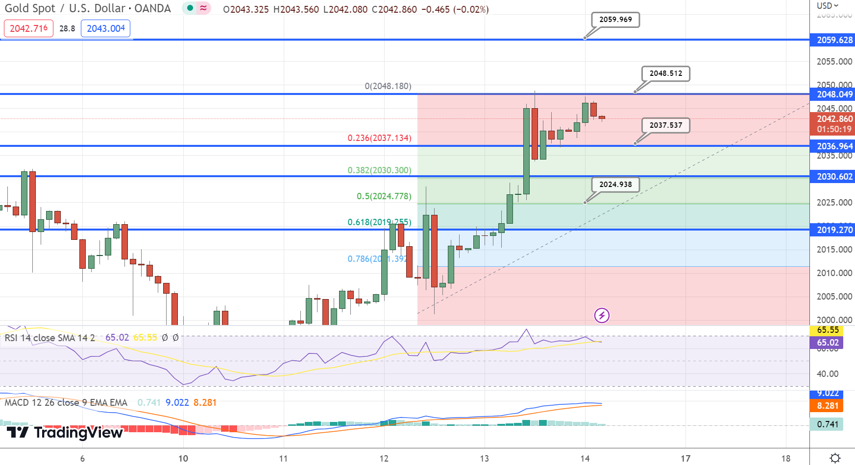 The GOLD price (XAU/USD) is gaining momentum to breach the key resistance level of $2,050.00 during the Asian trading session. After experiencing a temporary slowdown in its upward trend, the precious metal appears ready to continue its ascent.