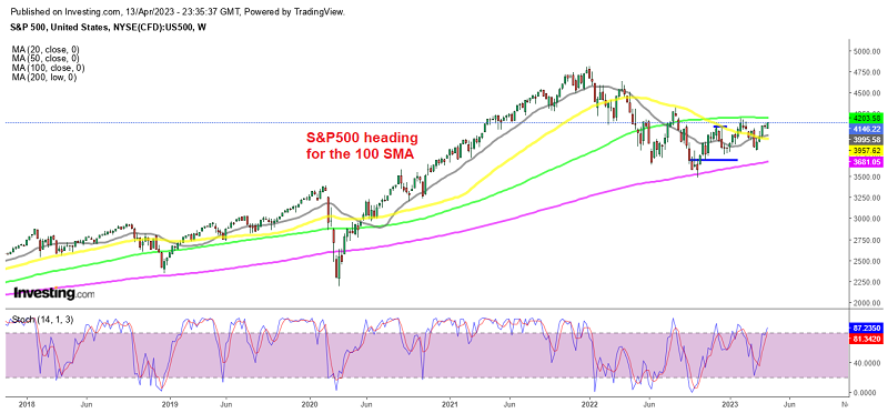 S&P500 is heading up toward the 100 weekly SMA as sentiment improves for stock markets, but still trades in a range between 2 MAs