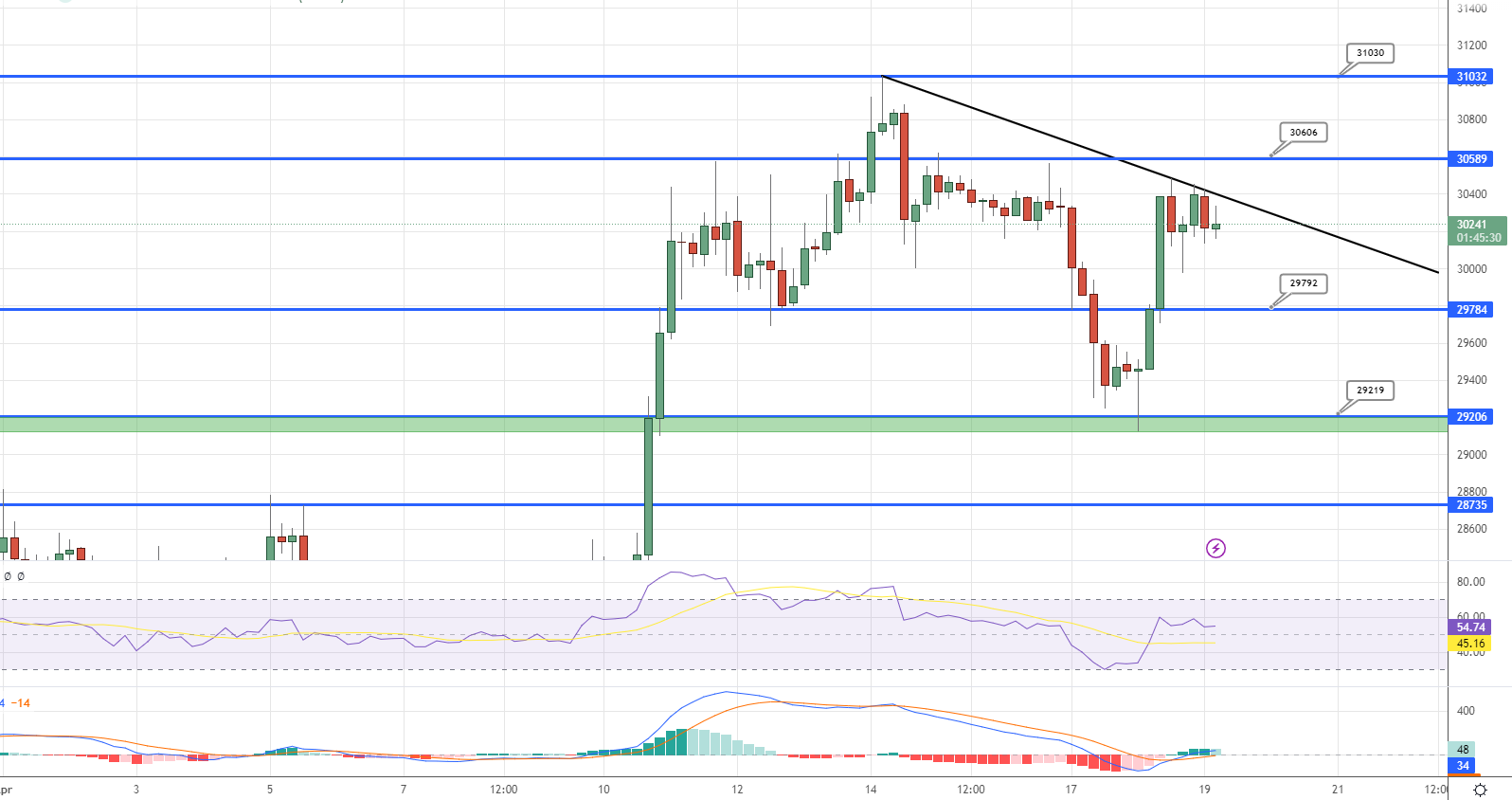 The next key support zone is around $29,800, which coincides with the 50% Fibonacci retracement level of the recent upswing from the $29,123 low to the $30,480 high. A downward break and closing price below $29,800 might propel Bitcoin towards the $29,200 support level.