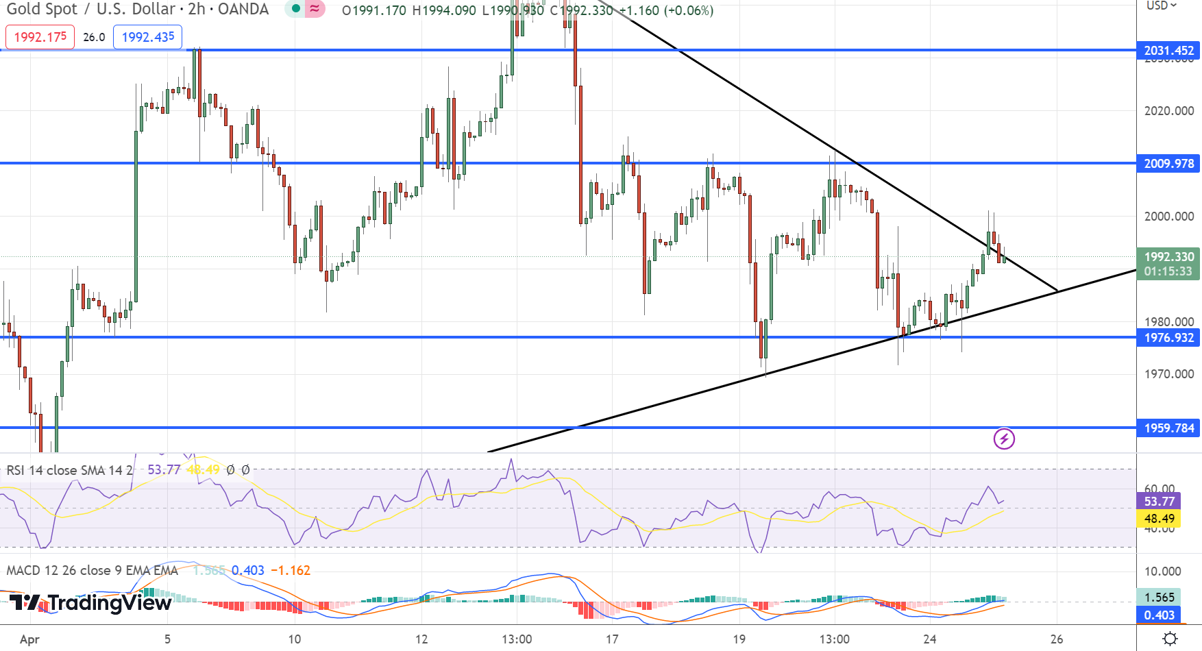 The GOLD price (XAU/USD) is nearing $1,996 as it extends its recovery from a five-week-old ascending support line during early Tuesday trade. As markets await the important US GDP and Federal Reserve (Fed) outcomes, the precious metal benefits from lower US Treasury bond yields and a weaker US Dollar. Concerns about the US debt ceiling, which is slated to expire in June, are also dragging on US bond coupons and the currency.