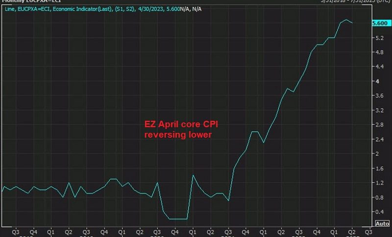 Headline inflation ticked higher in April in the Eurozone, but core inflation which is more important ticked lower to 5.6%