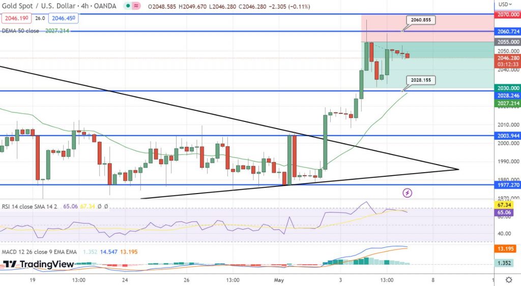 Investors are awaiting the US NFP data, which is expected to report a lower-than-previous addition of 179K payrolls in April, with steady earnings numbers expected. However, better-than-expected earnings data could renew inflationary pressure fears. Apart from this, any developments on debt ceiling concerns could make the USD Index highly volatile. GOLD technical analysis shows that the precious metal is currently building a base around the demand zone in a narrow range of $2,050.00, with the 10-period Exponential Moving Average (EMA) at $2,047.00 providing support to the Gold bulls after a sharp fall from an all-time high of $2,079.77.