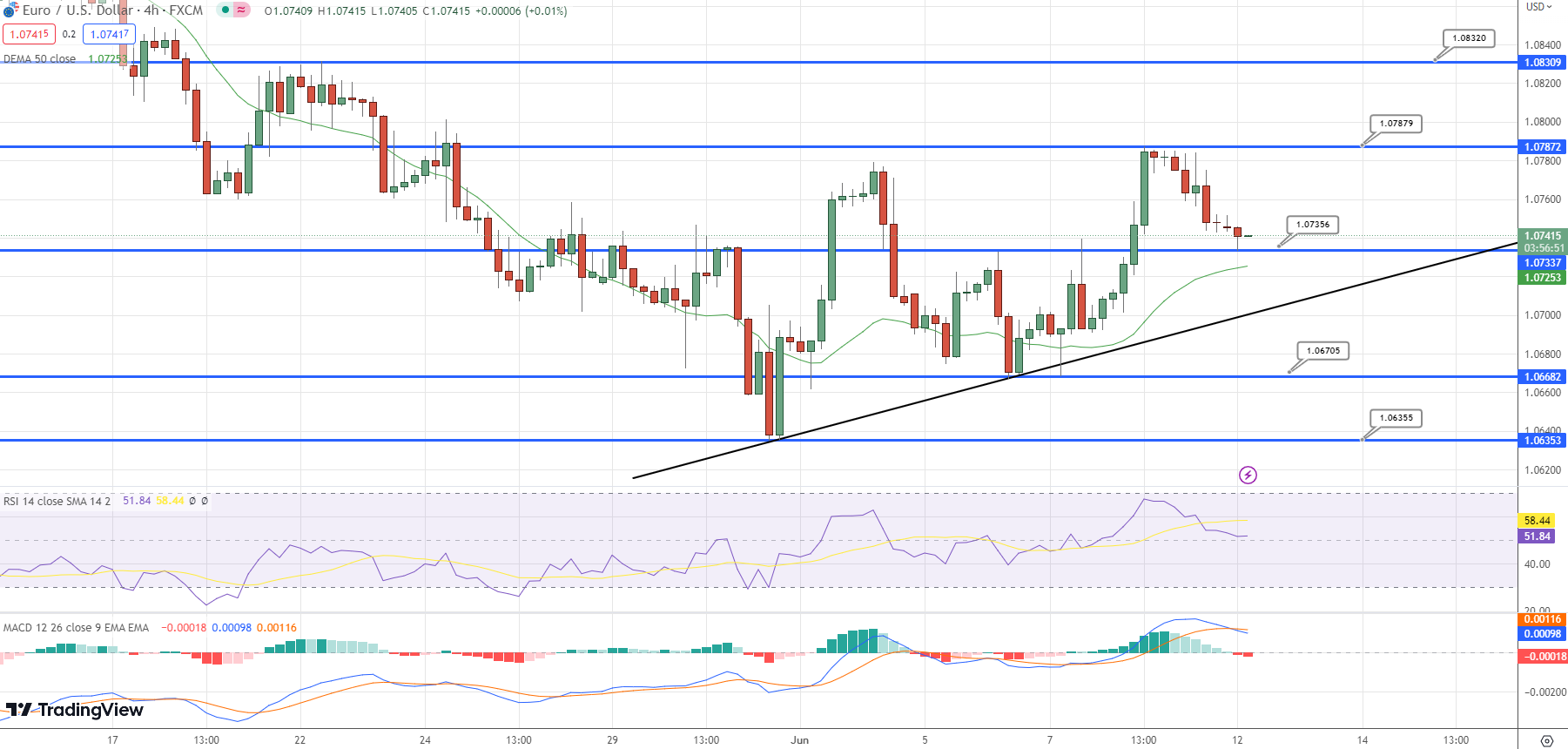 The EUR/USD pair continues to decline, reaching a new intraday low near 1.0750, as it retraces its first weekly gain in five. Market sentiment remains cautious as investors brace for key monetary policy decisions from the European Central Bank (ECB) and the US Federal Reserve (Fed). The Euro pair is weighed down not only by pre-event anxiety but also by challenges to sentiment and a reassessment of previous expectations regarding the ECB and Fed’s next moves. Meanwhile, the US Dollar Index (DXY) has declined in the past two weeks, falling to 103.56 most recently. Despite economic concerns, downbeat US activity data for May, coupled with disappointing employment indicators, have weighed on the US Dollar. The recent surge in United States Initial Jobless Claims and softer outcomes in US ISM Services PMI, S&P Global PMIs, and Factory Orders have pushed back Fed hawks, increasing expectations of no change in interest rates during the Fed’s upcoming policy meeting.