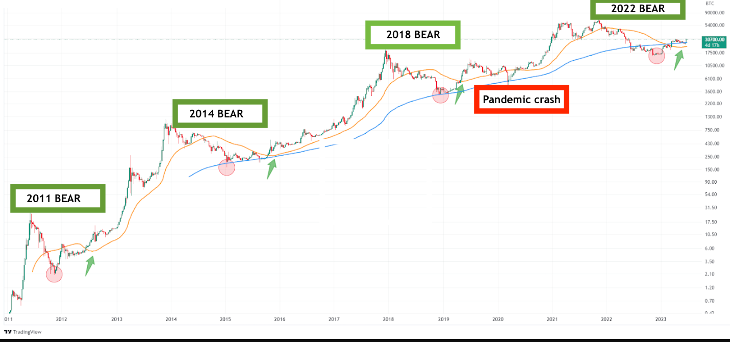 The Golden Cross results from the interaction between the 200-period and 50-period moving averages. Below is a visual representation of the February 2023 death cross, which took place after Bitcoin dropped by 77% from the 2021 ATH.
