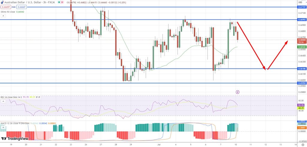 As such, the suggested approach for today is to consider a short position below this level, with potential targets at 0.6650 or 0.6618.