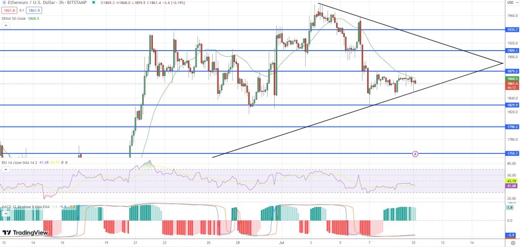 In the middle of the previous month, there was a significant surge in cryptocurrencies, with the ETH/USD pair surpassing the $1,900 mark. However, it fell short of reaching our predetermined take-profit target and began to retrace its gains.