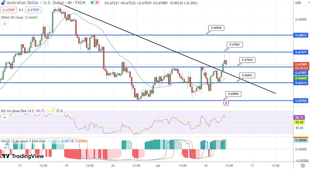 The AUD/USD currency pair has recently surpassed the resistance level created by a double top formation around 0.67024. This breakthrough suggests a potential bullish momentum for the pair. However, it is important to note that a downward trendline near the $0.67501 level may act as a barrier to further upside movement.