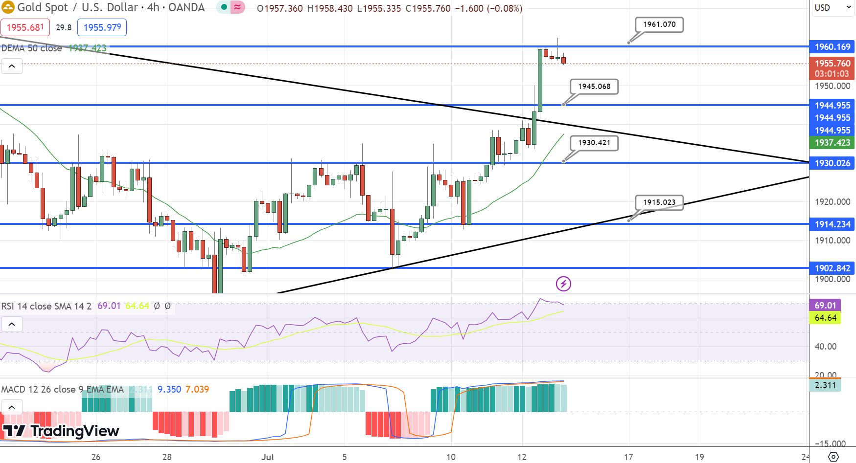 The XAU/USD ( GOLD price) encountered resistance around the immediate level of $1,960.00 during the late Asian session, indicating a potential breakthrough. Inflationary pressures in the United States have significantly eased, providing encouragement for the Federal Reserve (Fed) to proceed with only one interest rate hike by year-end, thereby supporting the anticipated resumption of the precious metal’s upward trajectory.
