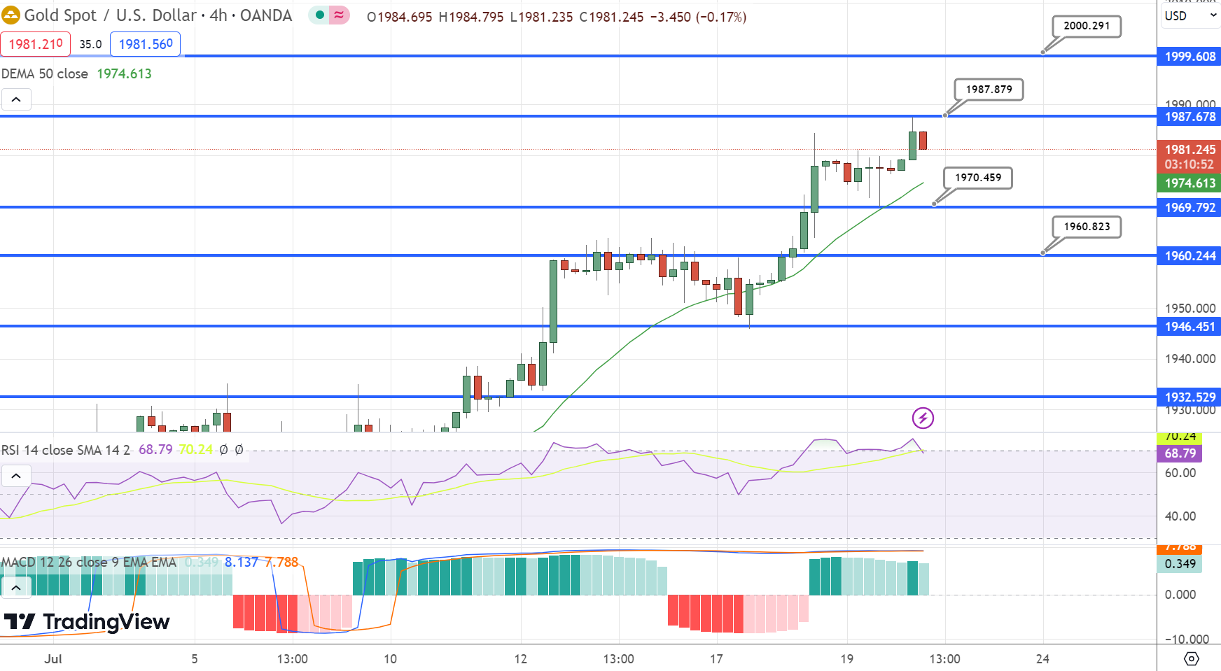 From a technical standpoint, the GOLD Price has moved higher, surpassing the $1,970 support confluence, which includes the Pivot Point one-day S1, one-month R1, and Fibonacci 23.6% on one-day charts.