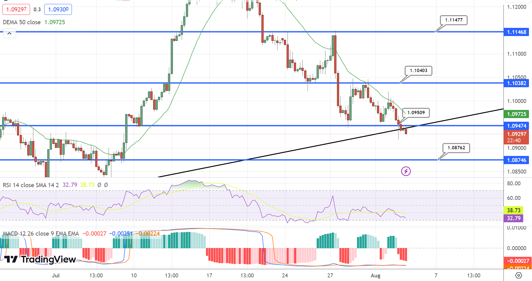 The EUR/USD pair finds itself at its lowest level since July 07, but it shows signs of bouncing back as it rebounds from a descending support line that has been in place for three weeks. The current level hovers around 1.0940.