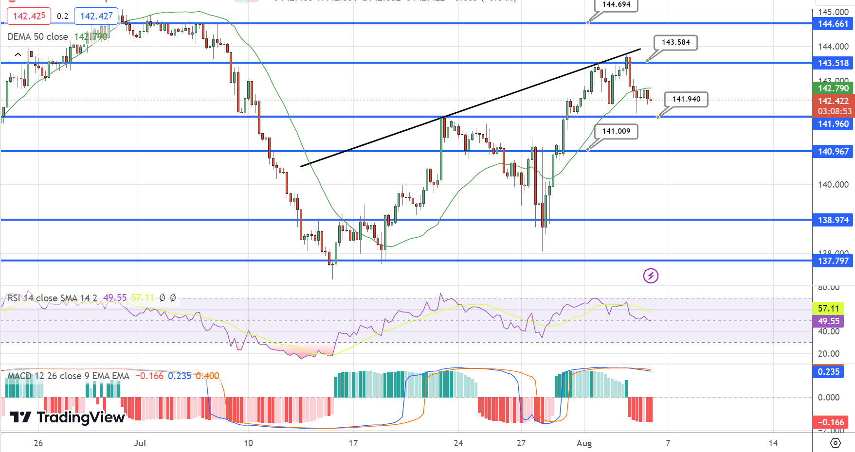 Adding to the bearish sentiment are signals from the MACD indicator and the clear adherence of the USD/JPY to the descending resistance line, visible since June 30, which currently stands at 143.40.