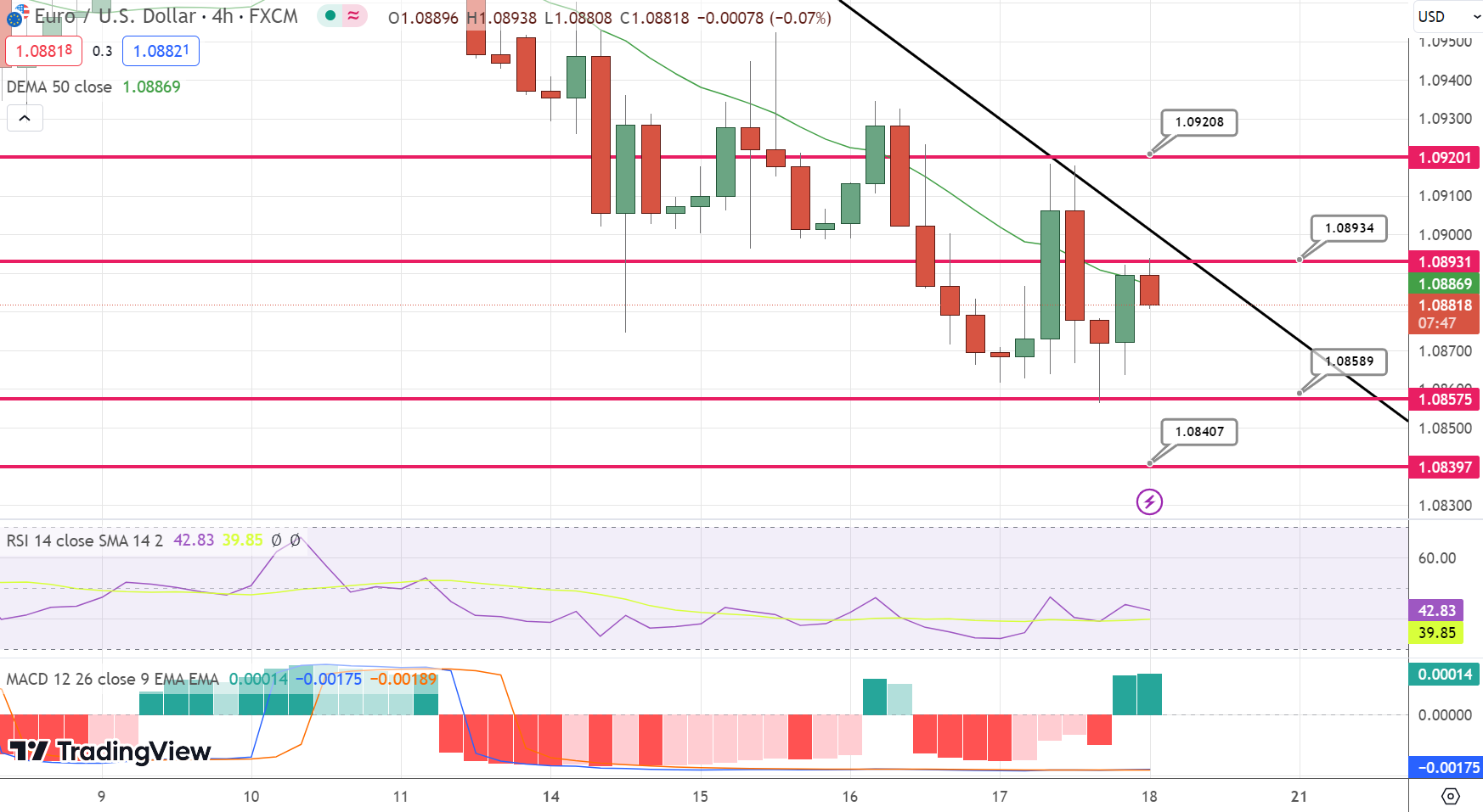During the Asian session on Friday, the EUR/USD pair displays upward movement, momentarily breaking a five-day losing streak that led it to a six-week low near the 1.0855 level reached the prior day. However, the current uptick exhibits limited momentum, with the current spot prices hovering around the 1.0885-1.0890 range, reflecting a modest intraday gain of 0.15%.