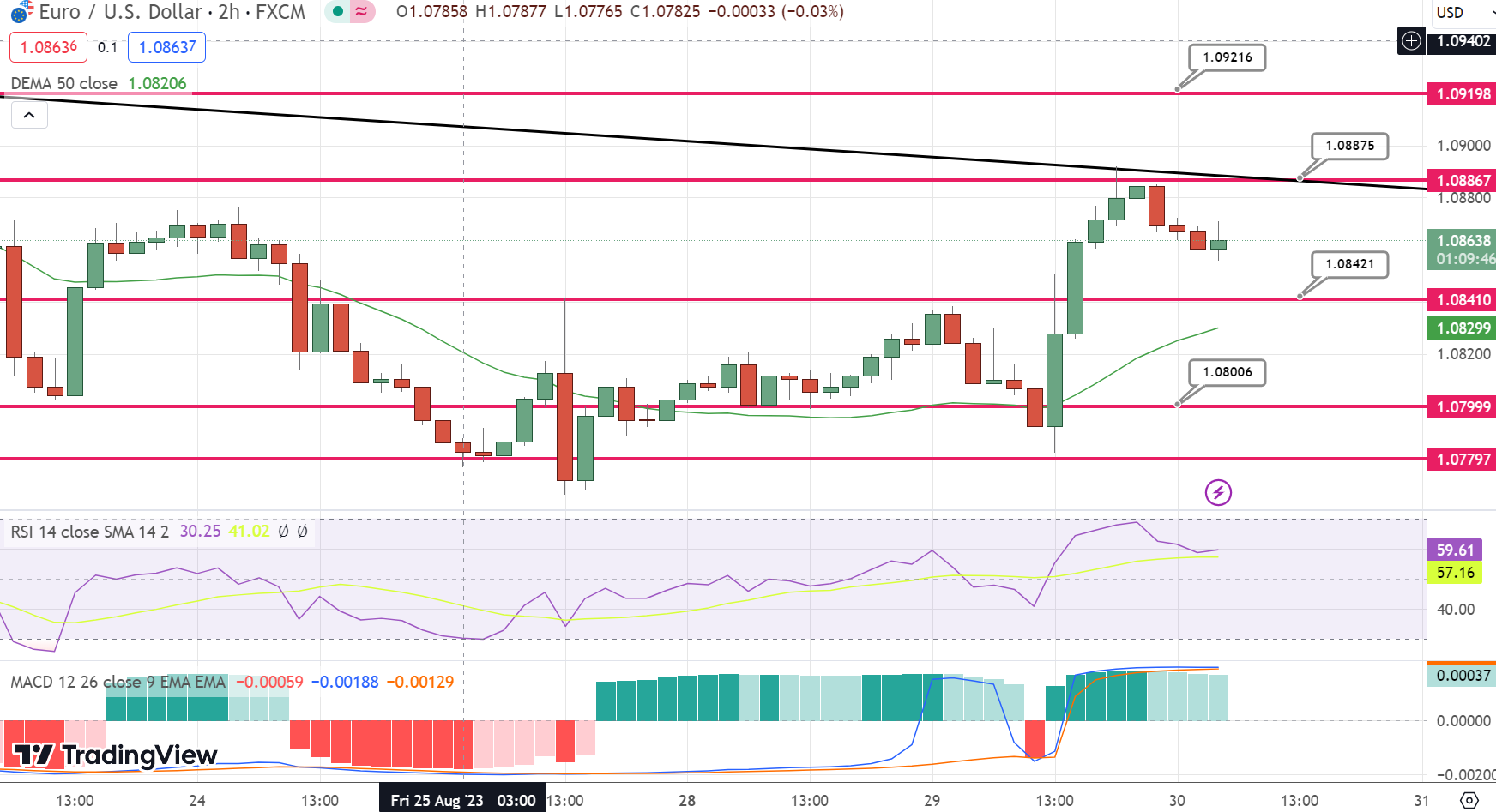[[EUR/USD]] is undergoing a reversal from its weekly peak, resulting in its initial daily decline in a span of three days as it hovers around 1.0860 ahead of the European session on Wednesday. This movement signifies traders’ positioning in anticipation of significant German and US data releases. The turnaround stems from the convergence of the 100-day Simple Moving Average (SMA) and a descending resistance line originating from mid-July.