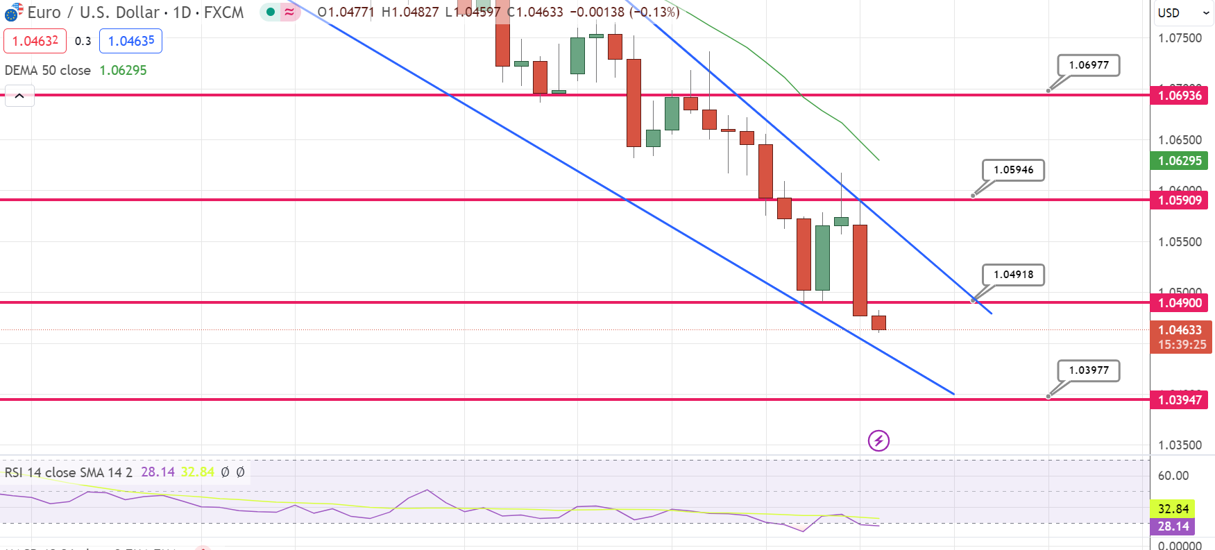 The EUR/USD continues its descent, hovering around 1.0465 after slipping past the critical 1.0500 threshold during Tuesday's Asian session.
