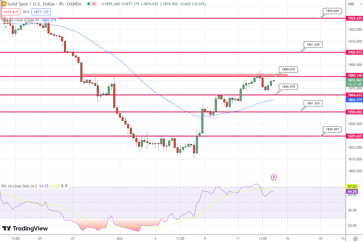 On Thursday, GOLD (XAU/USD) experienced a notable deviation from its over two-week peak of the $1,885 region, culminating near its daily range’s lower boundary. The upswing in US consumer prices for September surpassed anticipations, fueling speculations that the Federal Reserve may sustain elevated interest rates for an extended period.