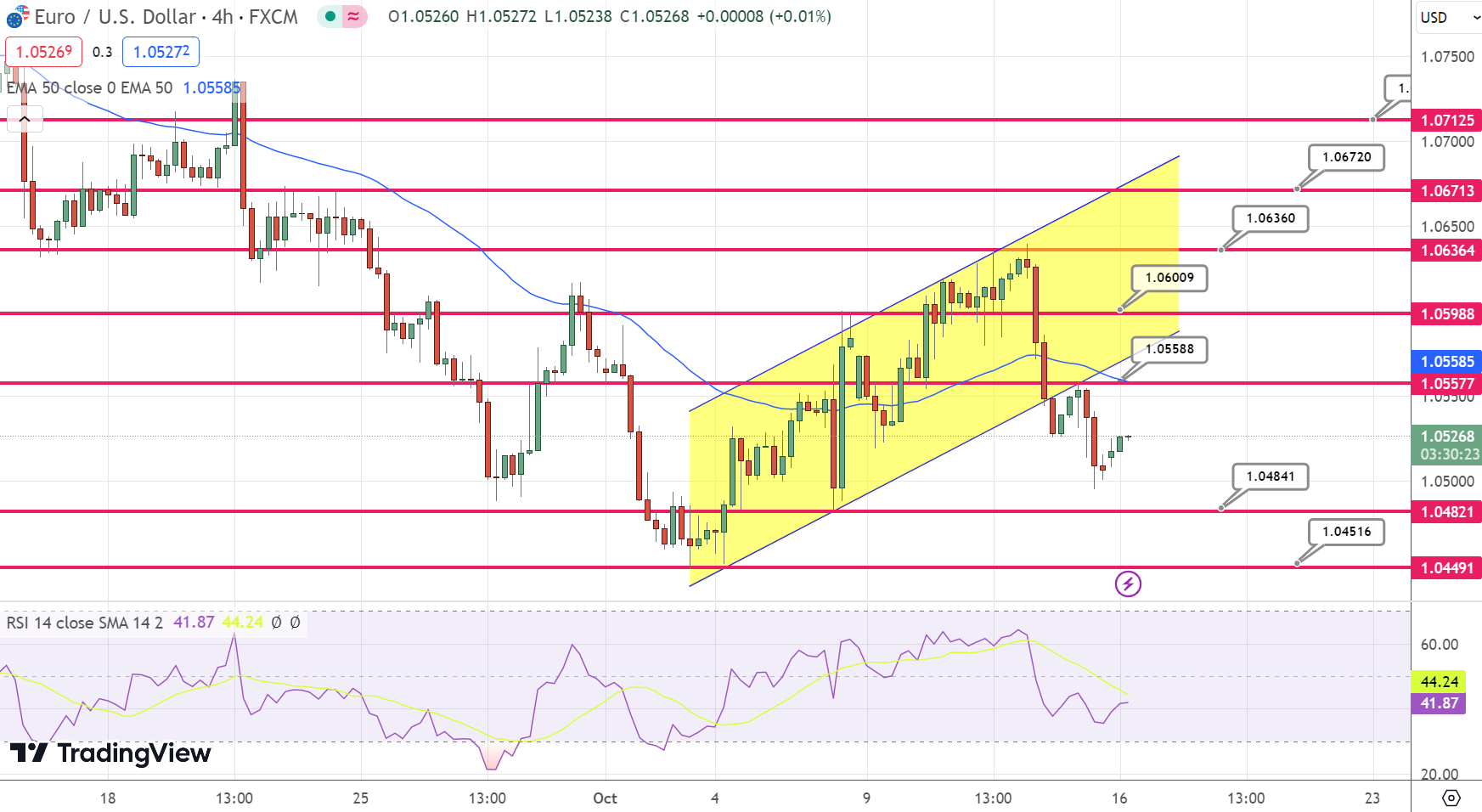 Contrastingly, the Bollinger Band’s lower boundary at 1.0477 serves as the EUR/USD’s primary support. The subsequent support layer is situated close to the October 4 low at 1.0450.