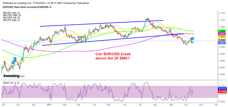 The US bond yields have continued to increase which has helped the USD and sent this pair to around 1.0450 before retracing to 1.06. Although the price failed to break above the 20 SMA (gray) on the daily chart, which has been acting as resistance, and after a doji candlestick, sellers returned again, with the price dipping just below 1.05. Although we have seen some bullish momentum in the last two days despite the climb in the US treasury yields, it seems like the correlation with the USD is losing.