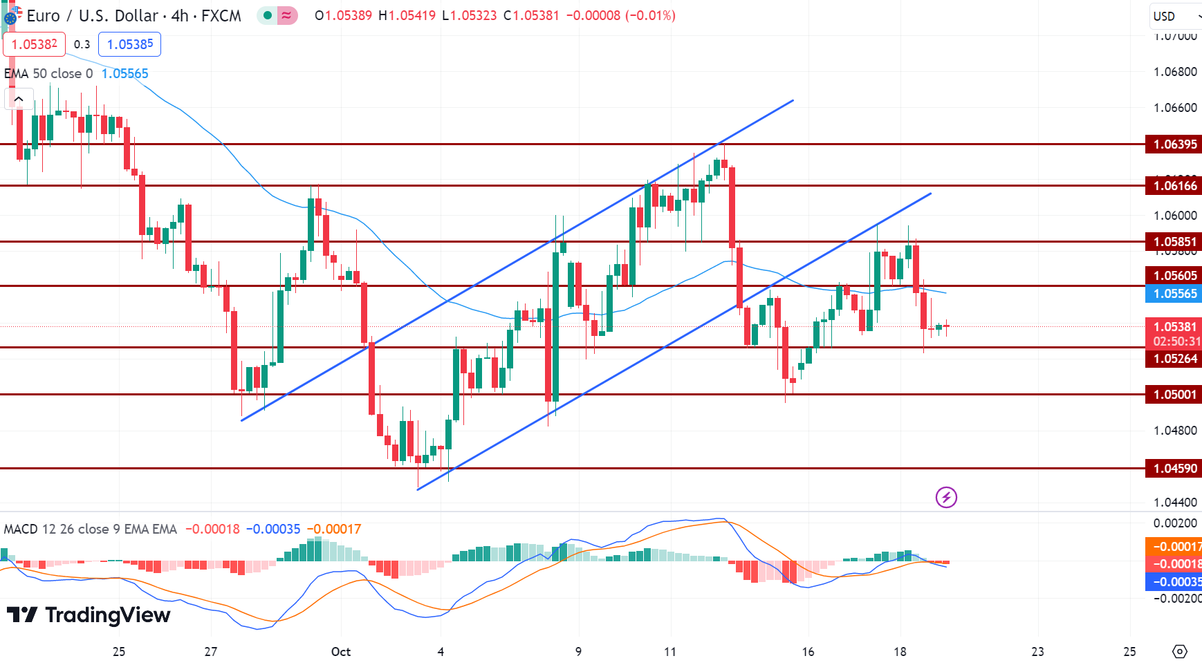 In the preliminary hours of Thursday’s Asian trading session, the EUR/USD tandem faces resistance, exhibiting a slight deceleration in its ascent. This perturbation is attributable to the mounting geopolitical tumult between Israel and Hamas, coupled with the mounting trajectory of US Treasury bond yields. Presently, the EUR/USD exchange hovers around 1.0538, marking a modest daily appreciation of 0.01%.