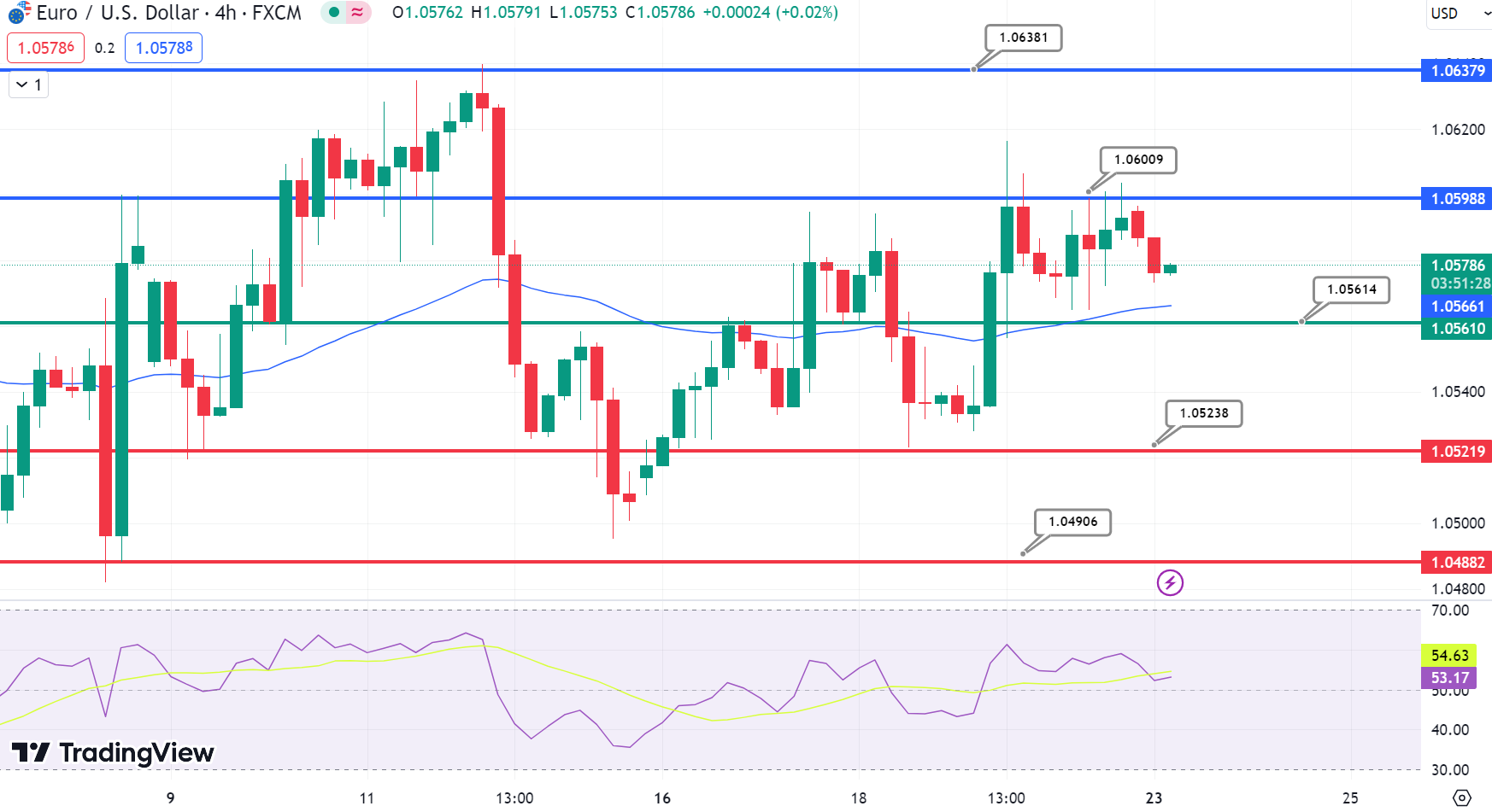 In Monday’s early Asian trading window, the EUR/USD pair experienced a downturn, reversing from its proximity to the crucial 1.0600 level. As the market braces for forthcoming data from the Eurozone and the US, eyes are also set on the European Central Bank (ECB) assembly slated for Thursday; a status quo on interest rates is widely anticipated. The pair hovers around the 1.0586 mark, shedding 0.07% for the day.