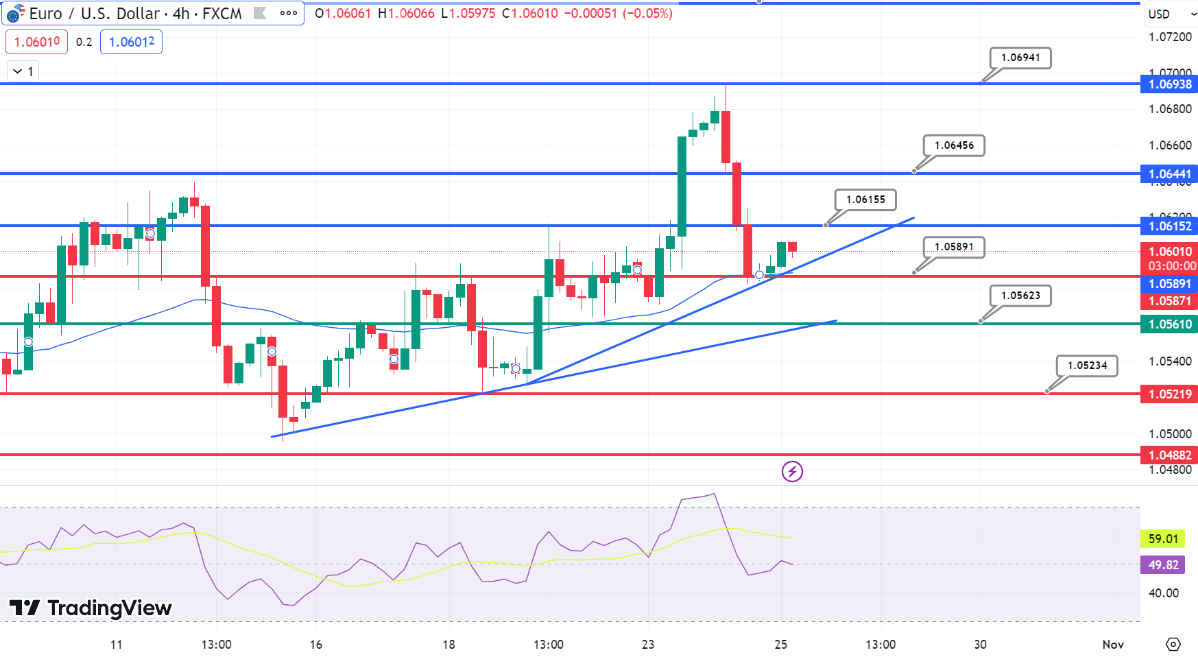 Inversely, potential downturns might find solace around the 14-day Exponential Moving Average (EMA) stationed at 1.0586, descending further towards the 1.0550 benchmark.