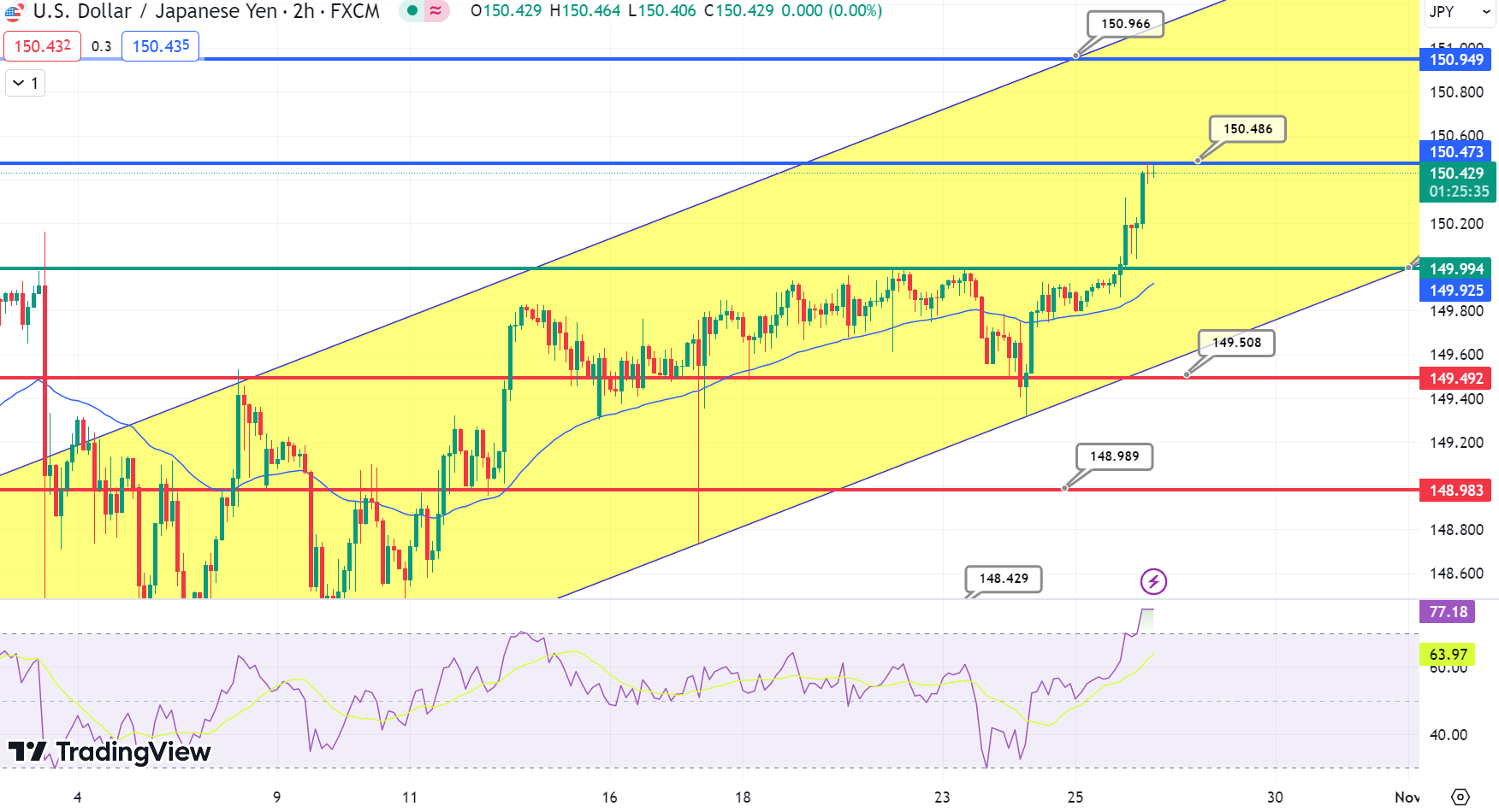 The USD/JPY currency pair is witnessing a notable rise, marking its annual peak as it navigates the dynamics of the Asian trading session on Thursday, settling near the 150.50 mark.