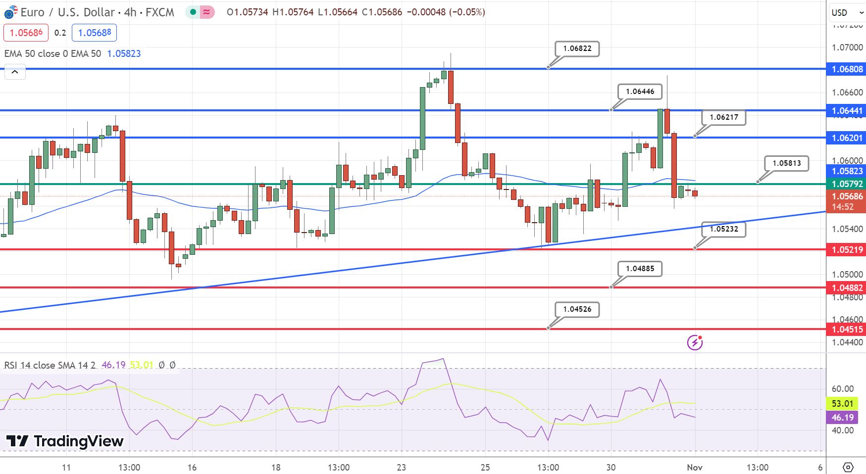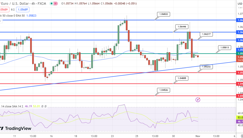 The EUR/USD currency pair is stable as the financial markets eagerly await the Federal Open Market Committee’s (FOMC) upcoming policy decision. Most people expect the current 5.5% interest rate to be kept in place at the November meeting. In the midst of the Asian trading session on Wednesday, the pair is seen trading modestly lower, lingering around the 1.0570 mark.