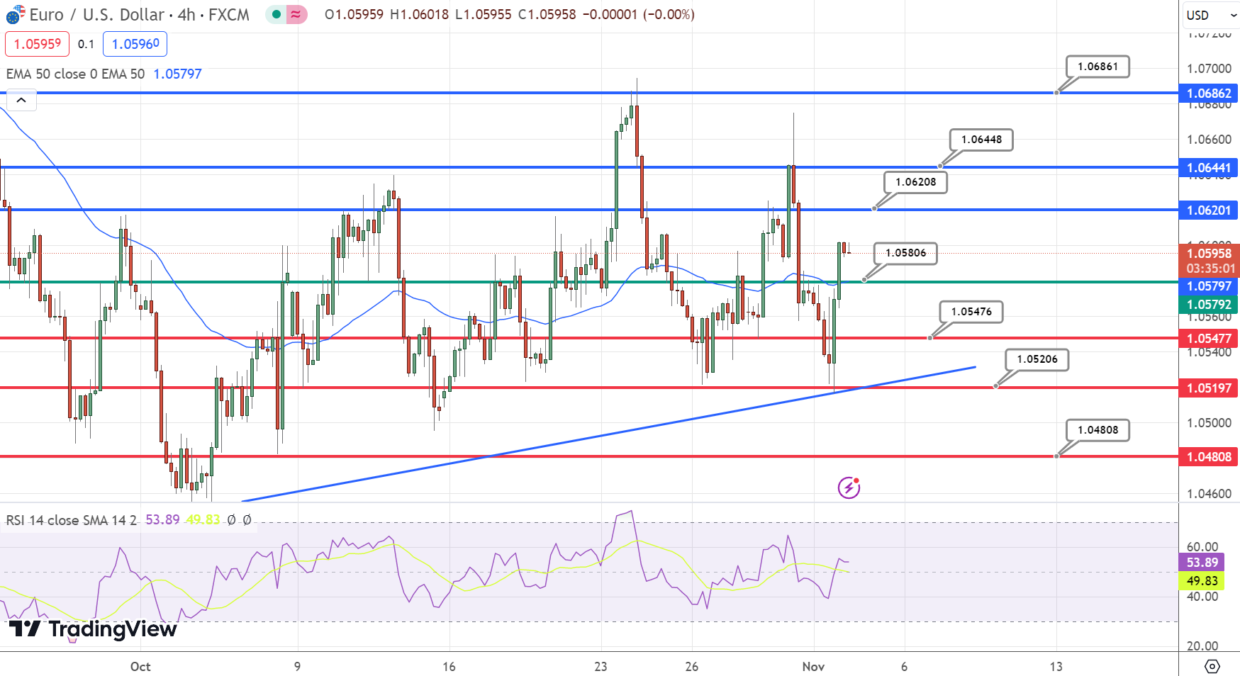 During Thursday’s early Asian trading session, the EUR/USD pair experienced a notable ascent, surpassing the 1.0580 mark. This upward trajectory was primarily attributed to the US Dollar’s diminished strength following the Federal Open Market Committee (FOMC) meeting. The major currency pair is currently positioned around 1.0597, marking a 0.26% increase for the day.