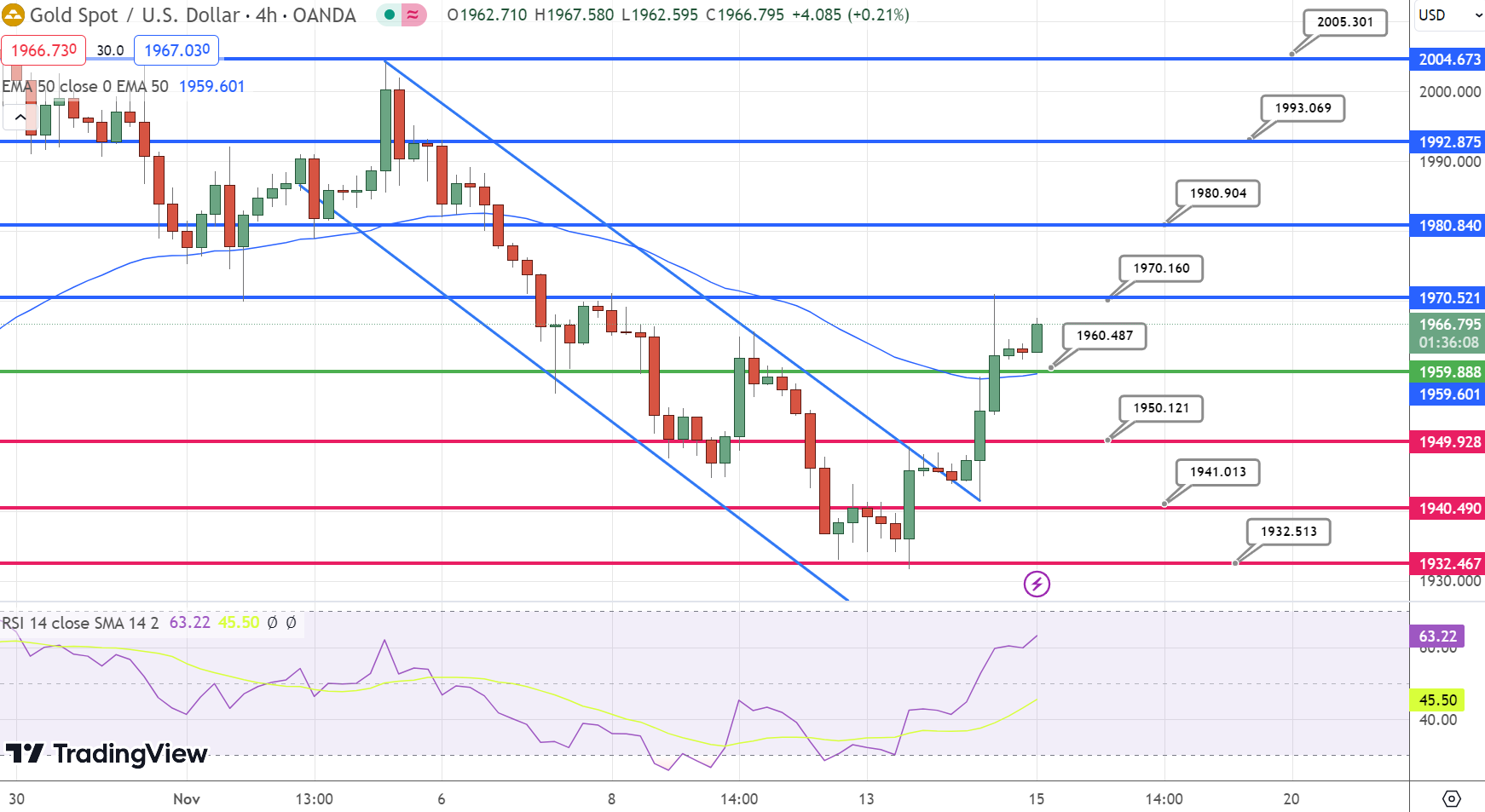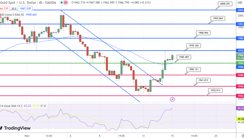 Expectations that the Federal Reserve may halt interest rate hikes are capping significant gains in the USD, indirectly supporting gold prices. This scenario hints at a potential upward trajectory for gold, following its rebound from the 200-day Simple Moving Average near $1,930—its lowest since October 18.
