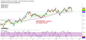 During this time, the EUR/GBP has gained more than 250 pips, with lows rising, providing us with solid opportunities to buy this pair, such as the one yesterday when the price retreated lower to the 200 SMA (purple) on the H4 chart. This moving average has been acting as support and yesterday we decided to open another buy EUR/GBP signal at this moving average.