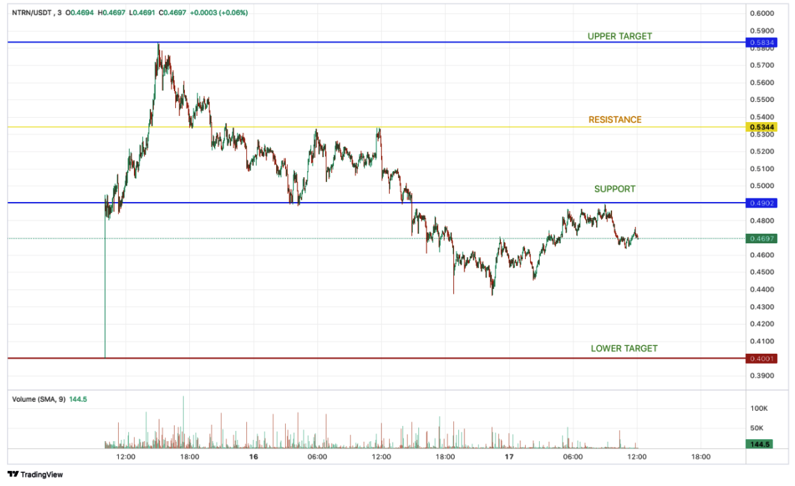 In the unfolding market dynamics, the NTRN/USDT pair is poised at a critical juncture, nearing the pivotal support level of $0.4902. The momentum suggests that a sustained upward push by buyers could lead to a potential shift of the $0.5344 price into a minor support level. If successful, testing the upper target at $0.5834 becomes plausible, representing the coin’s all-time high since listing on Bitget. Conversely, a weak bearish scenario is plausible, considering buyers have found robust support at $0.4500. The likelihood of retesting the lower target, Bitget’s listing price, remains low at this point.