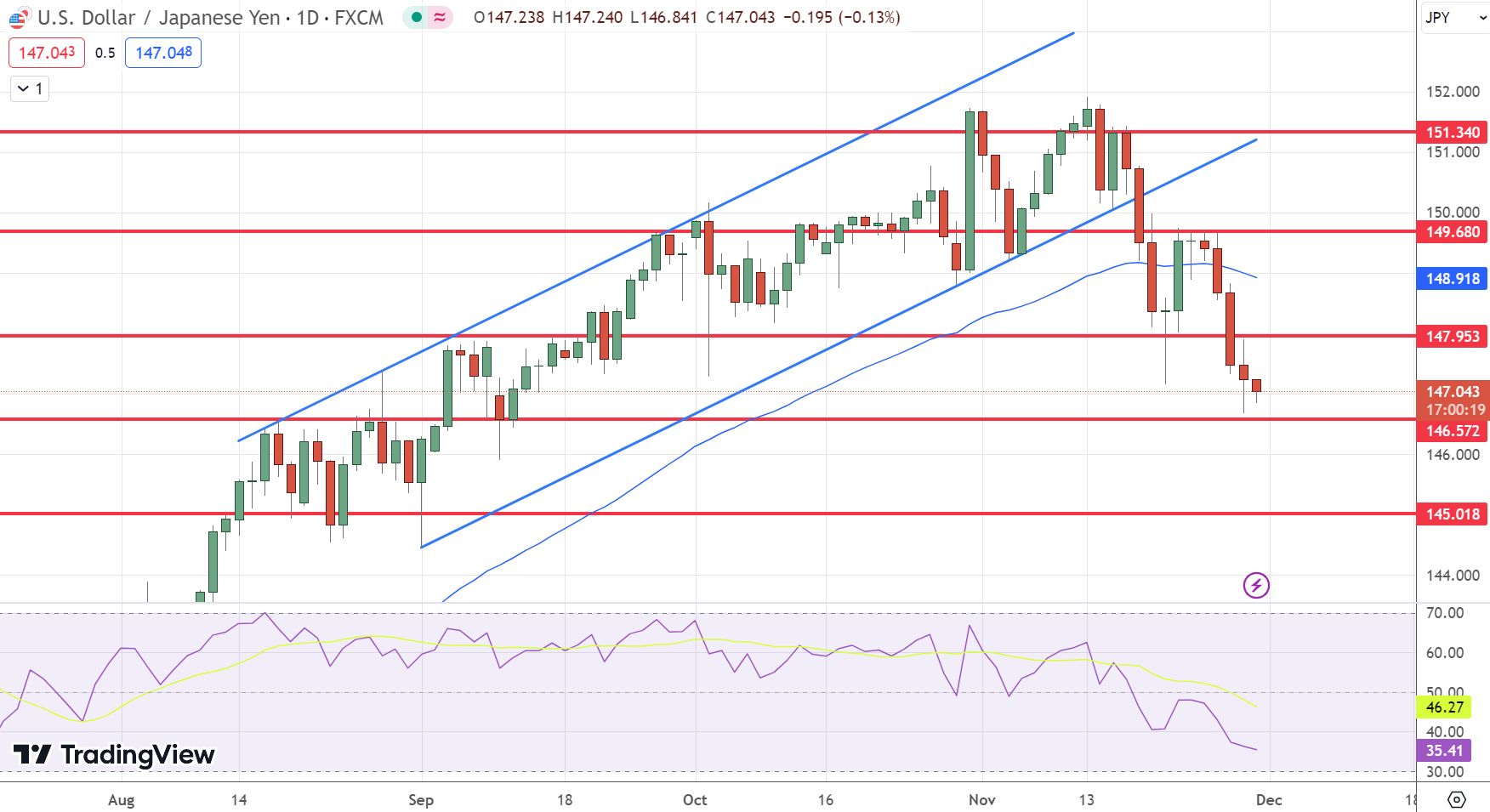 The day’s projected trading range lies between support at 146.20 and resistance at 147.60, with a bearish trend expected to dominate.