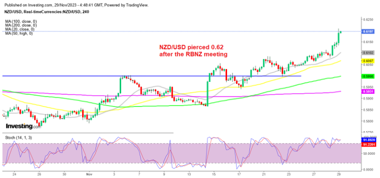 Early in November, the NZD turned bullish as the USD fell on softer Fed statements, while risk sentiment improved, driving commodities dollars higher. This pair was on a long-term bearish trend that put the price above moving averages on the daily chart, and buyers have pushed the price back above them, which may be turning into support if buyers wish to maintain the positive momentum.