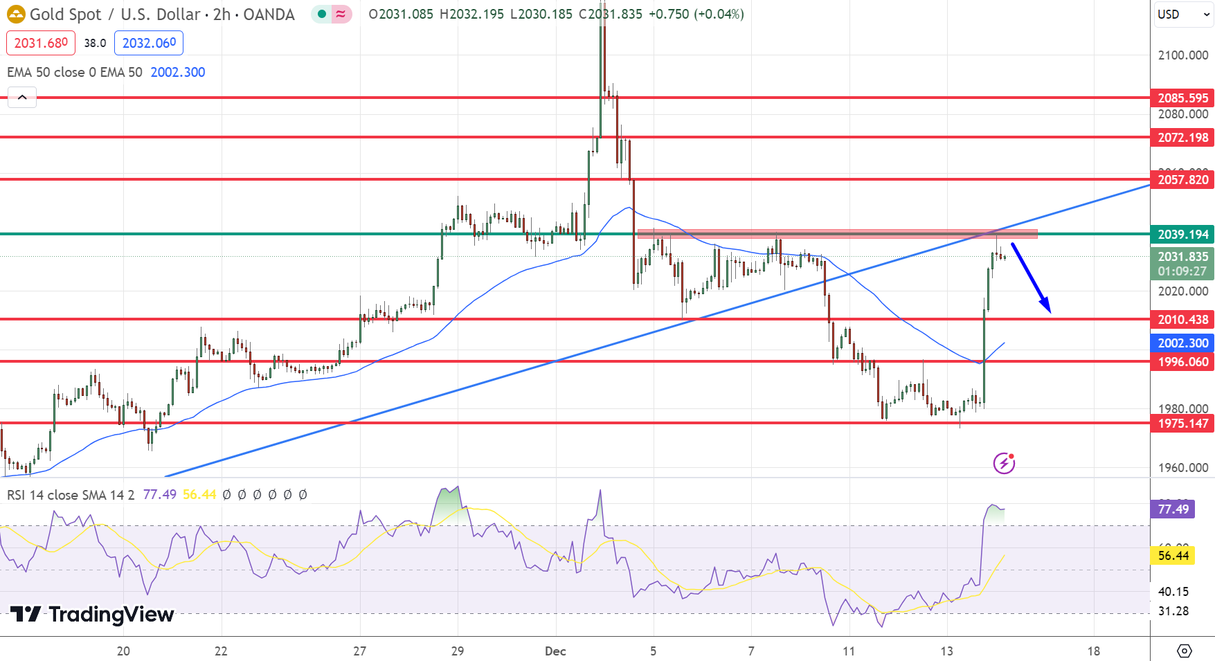 This follows the Federal Reserve’s indication that it may cease interest rate hikes, with projections showing potential for three rate reductions in 2024, aligning with the Fed’s inflation targets. Subsequently, a sharp drop in U.S. Treasury yields and a weakened U.S. Dollar have buoyed the precious metal, which typically thrives in low-yield environments.