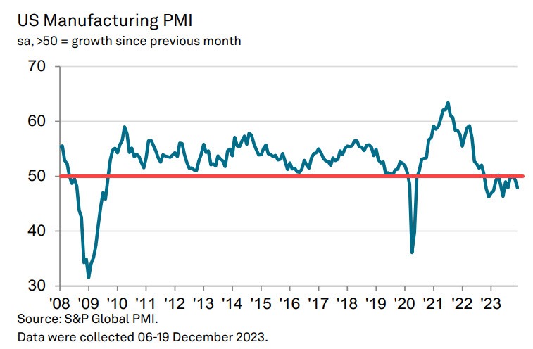 - PMI Decline: The S&P Global US Manufacturing PMI dropped to 47.9 in December, indicating a modest but accelerated decline in the sector’s health.
