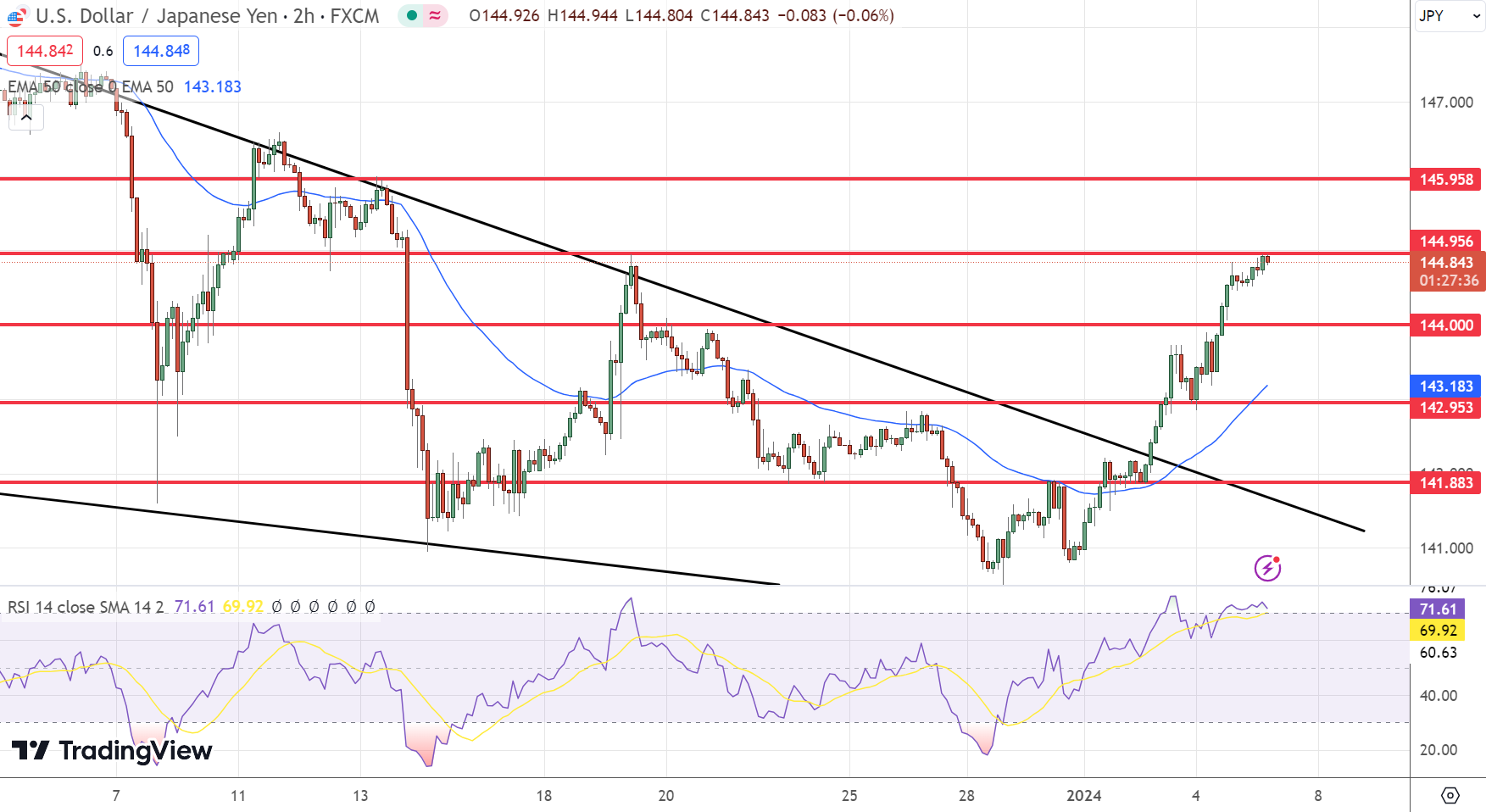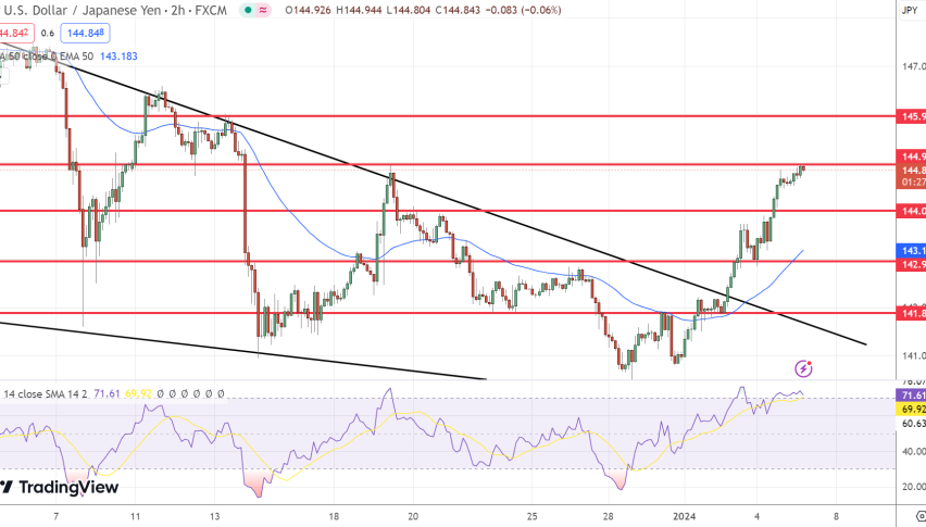 From a technical perspective, USD/JPY’s bullish trend is underpinned by its successful breach of the 144.90 level, suggesting potential for further gains. However, Stochastic indicators hint at possible sideways movement due to current negativity, with a key support base at 142.35 to watch for. Today’s expected trading range is between 144.00 support and 145.90 resistance, maintaining a bullish outlook for the session.