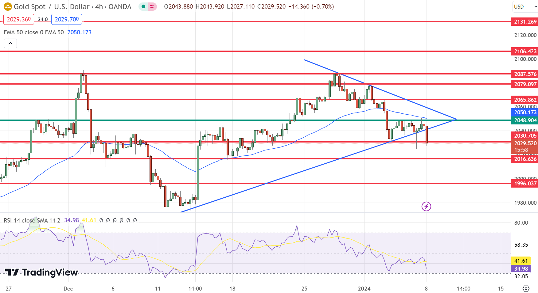 The GOLD price has experienced a bearish bounce after testing the 2065.70 level, now settling below the 50-day EMA. This situation maintains a bearish trend in the short term, with a potential test of the 2016.90 level.