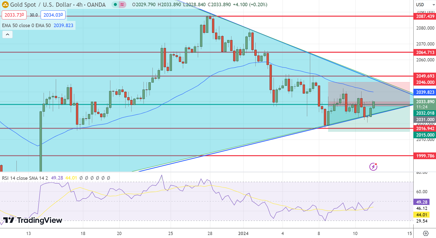 Gold’s current positive momentum is partly due to market adjustments ahead of the US inflation figures. The market initially reacted to the Fed’s dovish stance in December, anticipating substantial rate cuts by 2024. However, robust US economic indicators and mixed messages from Fed officials have led to a reassessment of these aggressive easing expectations.