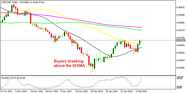 USD/CHF was sliding lower last week after making a positive turnaround at the start of 2023, but buyers are in charge again and it seems like we’re witnessing a bullish breakout. The price has broken above the 50 daily SMA which acted as resistance before, opening the door for further gains, however, one last obstacle stands in the way.