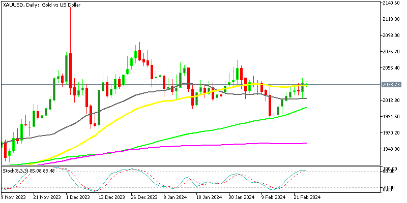 After the forty-dollar drop in Gold prices two weeks ago, the price reversed back above $2,000 again and continued climbing. Last week buyers were attempting to push the price over the 50 SMA (yellow) but they kept failing. However, on Friday we saw a strong Bid in Gold which sent the price above the 50 SMA, so the resistance is now broken.