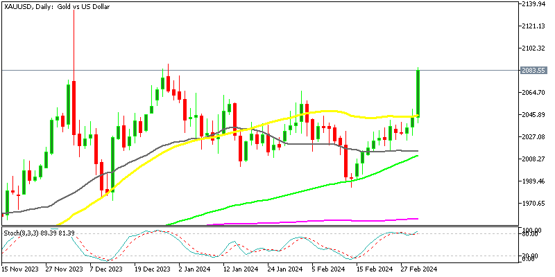 Gold continues to display strength, making gains whenever it finds the chance. Yesterday the Gold price XAU jumped $20 and held the gains against the USD, while other assets turned bearish. Today we are seeing another surge as XAU/USD heads for $2,100.