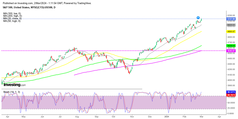 Stock markets have been on a strong bullish run since November, making new record highs continually. S&P 500 pushed above 5,000 points early this month, and this week it closed above 5,100. This was the best February in a decade for this stock index and the upside momentum doesn’t seem to stop.