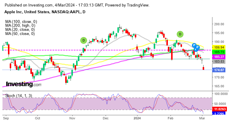 Stock markets have been surging in the last several months, as traders anticipate central banks to start a policy easing period soon, and tech stocks are leading the way. But not Apple shares which have been bearish and are plummeting now. AAPL was trading at $200 by December, but turned lower and have been making lower highs since then. The area around the $185 level was holding as support for two months, but that support zone was broken today after the bearish gap. Now Apple stock is trading at $174 and continues to slip lower, looking very bearish.