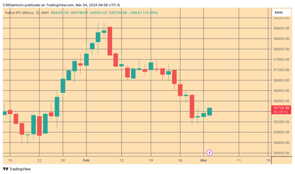 The Mexican Stock Exchange (BMV), the main index, is up by 0.40%. In Mexico, inflation figures for February are expected.