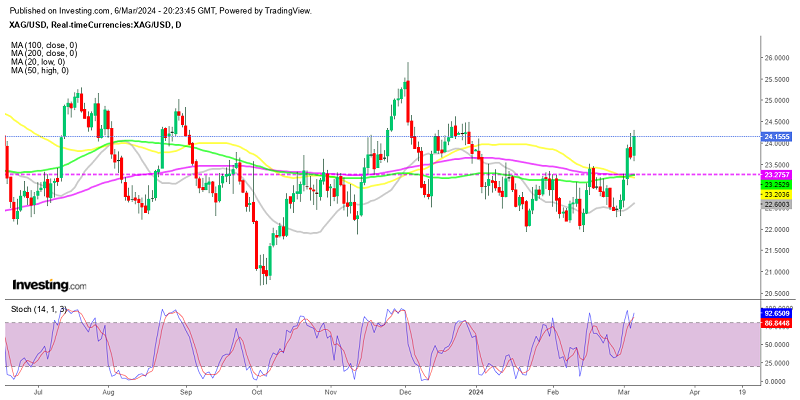 Silver was finding resistance at moving averages throughout this year, which were keeping it in check below $23,50. But in the last several days we have seen a strong rally in XAG/USD, which has sent the price of Silver above the moving averages on the daily chart. Today we saw some soft figures from the US labour market, which increased the bid for safe havens, such as Gold XAU and Silver XAG.