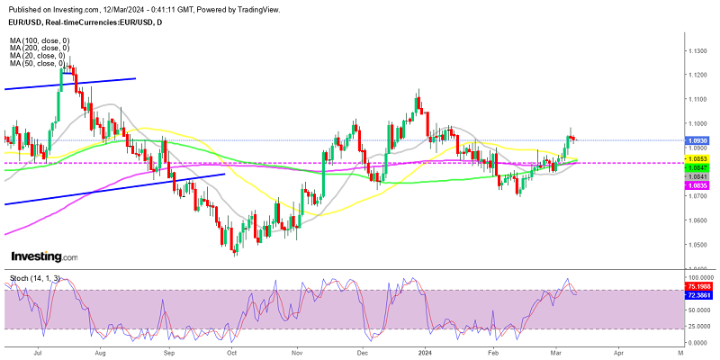 The euro to dollar rate increased considerably in the last few weeks, but it has formed a bearish chart pattern after failing to reach 1.10 on Friday. EUR/USD gained almost 3 cents since mid-February, and got within reach of the major level at 1.10, but the buying stopped just below that level and now it seems like we might see a deeper pullback after the final German CPI inflation report, however, traders are waiting for the US inflation report as well before making a decisive move.