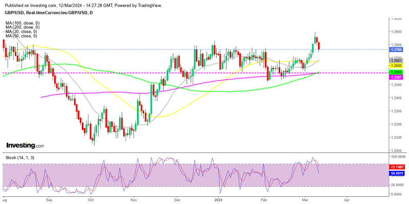 [[GBP/USD]] showed immense strength last week, gaining around 250 pips but it failed to reach 1.30, as the price reversed just below 1.29 on Friday, helped by a mixed NFP report from the US. Yesterday the GBP was the weakest among major currencies, with the price dipping below 1.28.